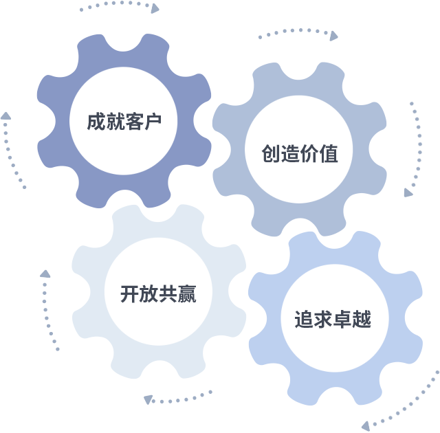 成就客户是一切决策的出发点,,,创造价值是衡量所有工作的标准,,,追求卓越是我们做事做人的态度,,,,开放共赢是我们的格局也是最终的结果。。。价值观的齿轮环环相扣,,推动着组织里的每个人不断向前。。。。